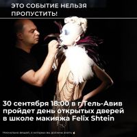 ![]() | Это событие нельзя пропустить!30 сентября 18:00 в г.Тель-Авив пройдет день открытых дверей в школе макияжа FELIX SHTEINПришло время найти профессию своей мечты и добиться успеха !Что будет ?А Будет очень интересно!Мы познакомим вас с миром визажа и поможем выбрать и определиться какое направление в макияже подходит именно вам! Феликс проведет мастер-класс по теме «трансформация» и вы увидите магию... |